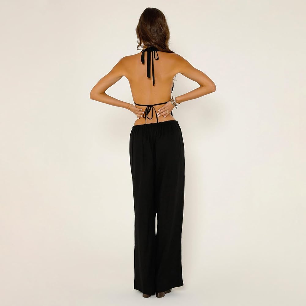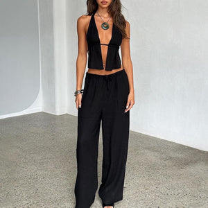Show off your bold side with this striking black crop halter top and baggy pants combo. Designed for those who love to make a statement, this outfit offers the perfect mix of sexy and relaxed chic.